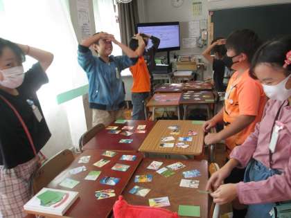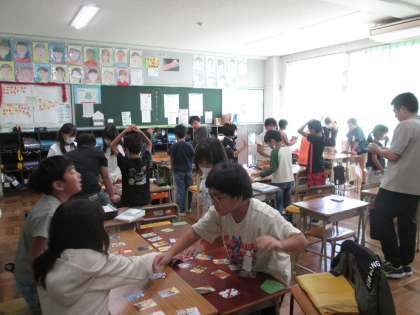 4年4組は総合学習で、江原素六先生についての学習です。素六先生のカルタで、遊びながら学んでいます。みんな夢中でカルタをとっています。