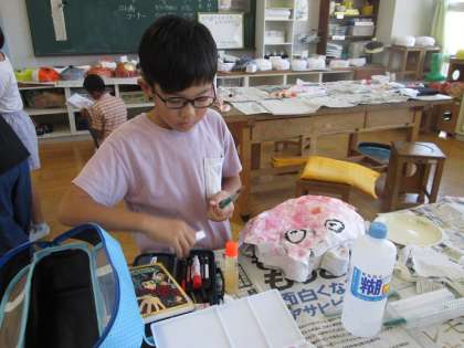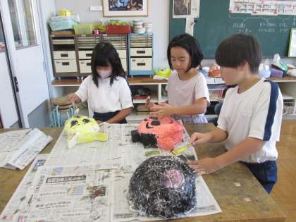 4年3組は、色塗りから仕上げのニス塗りに入っている子がいました。どれもおもしろいお面ができました。