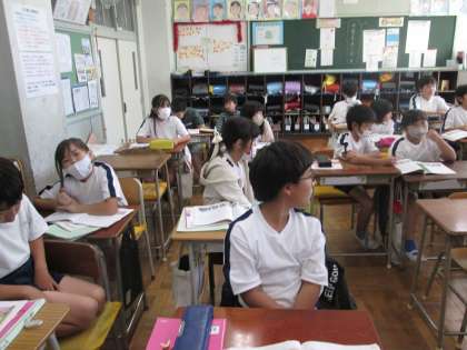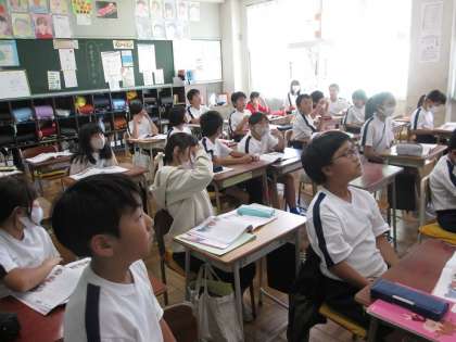 4年4組は道徳です。礼儀についての学習でした。「女王様はなぜフィンガーボールの水を飲んだのか」という問いに、自分の考えを発表していました。