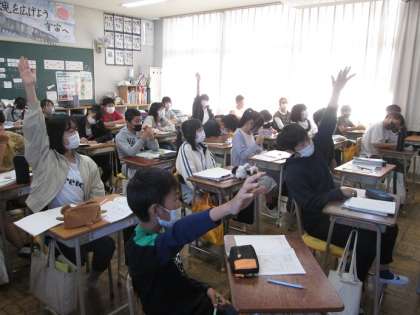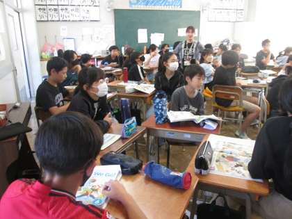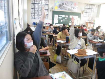 6年3組は、算数の面積の学習です。ひし形や円柱の面積の求め方を発表していました。「ああ、そういうことか」と友達の意見を聞いて、納得している子がいました。それが学びなのですね。
