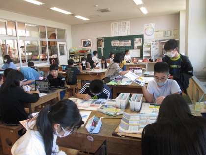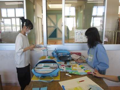 6年1組は図工の学習です。思い出の風景に、絵の具が鮮やかにのせられていきます。丁寧に色づけをしていました。