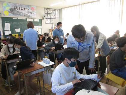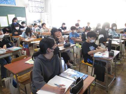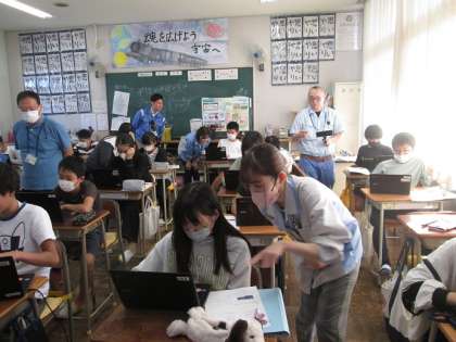 6年3組は明電舎さんとのコラボ授業です。防災に関する調査結果を発表した後、防災マップ作りに取りかかりました。地図上にまとめるのは、交通安全教室の資料作りでやっているのでスムーズです。