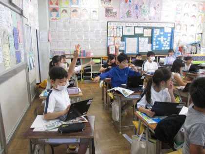 4年3組は社会科「自然災害から身を守り隊」の学習です。学校が取り組んでいる防災を見つけChromebookで写真を撮ってきて発表していました。