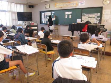 4年2組は音楽です。「スタッカート」という新しい言葉について学んでいました。そんな働きをする記号なのか覚えましたか。