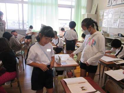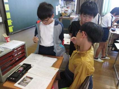 3年生は国語で「ネコのひげ」という教材を学習しています。ワークシートに要点を書き込み、みんなで考えを見合いました。