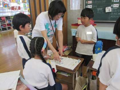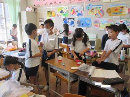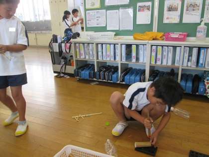 2年生は国語で「しらべて書こう 〜作ってあそぼう〜」という説明文を学習しています。総合学習として、自分たちで作った説明書を見ながらおもちゃを作っていました。