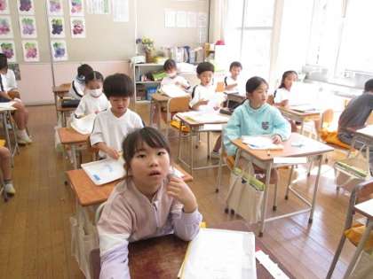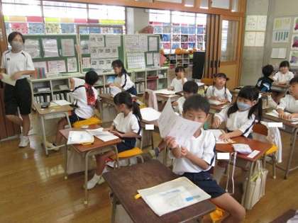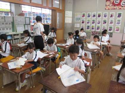 1年生の学習の様子です。学級活動の時間において、いろいろな配布物を分けていました。