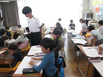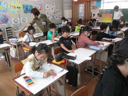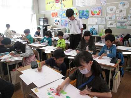 2年生は図工で「ことばのかたち」という題材を学習しています。下絵ができた子から水彩絵の具を使って描いています。