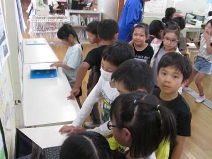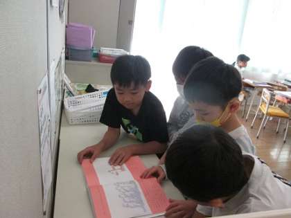 2年生は図工で「ことばのかたち」という題材を学習しています。お話を聞いて、思い浮かんだことを絵に表す活動を行っていました。