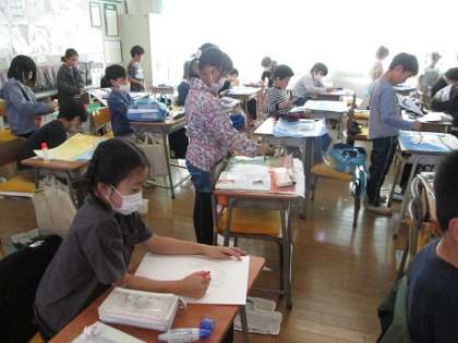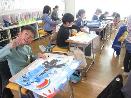 3年生は図工で「紙版画(ミラクルワランドランド)」という題材を学習しています。紙版画の作品にあうよう、バックを絵の具で塗って調和させていました。