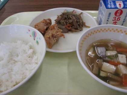 「ご飯 牛乳 鶏の唐揚げ ごぼうのきんぴら けんちん汁」