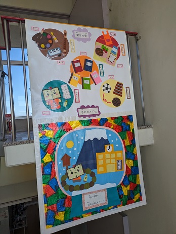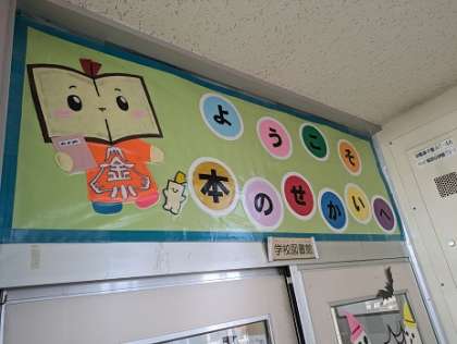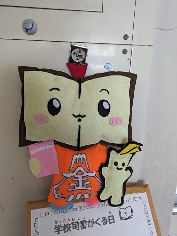 図書館ボランティアさんが学校整備を行っています。いつもありがとうございます。公式キャラクターの「かなほん」がみんなを出迎えています。