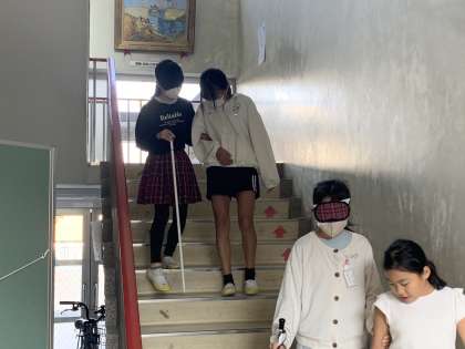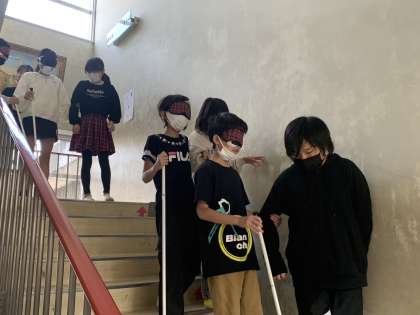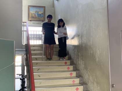 アイマスク体験をしています。介添えがないと歩行が難しいです。