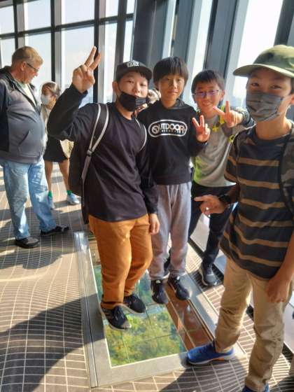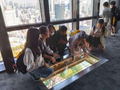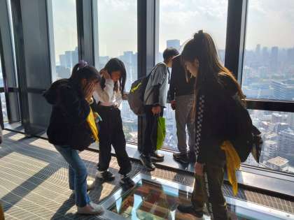 ガラスの床に立ち、150メートル上空から真下を見下ろしています。