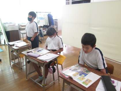 なかよし4組は高学年は国語「秋」の学習です。もみじ狩りってどういうことなのかな?とみんなで考えていました。低学年は算数の学習です。カードを使って計算しています。