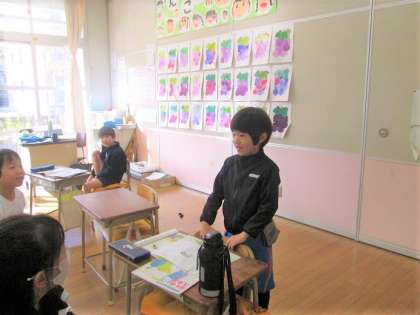 1年1組は道徳「はしの上のおおかみ」です。みんなで、おおかみの気持ちになって考えています。友達の発表に対して、拍手している姿が見られます。