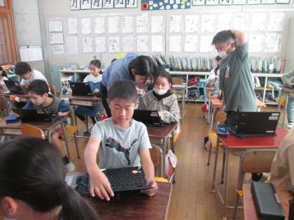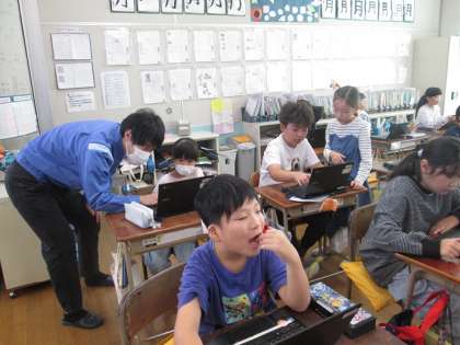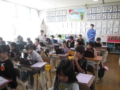 3年1,2組は明電舎さんのゲストティーチャーをお招きし、「金岡の宝」のスライド作りをしました。写真をコピーして貼り付けるというやり方も身につけています。