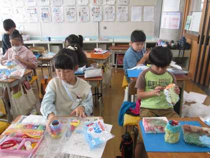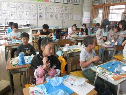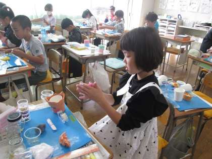 3年4組は図工「あきようきのへんしん」です。紙粘土に絵の具を混ぜながら、カラー粘土にしていきます。「けっこういい青ができた!」と手を動かしながらうれしそうに言う子がいました。空き容器が本当にクジラなどに素敵に変身していますね。