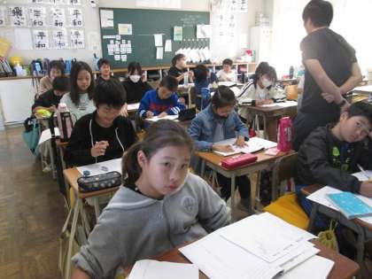 5年2組は音楽です。「夢の世界を」の歌から、旋律の違いについて考えていました。「mfから始まっています」と気づいたことを積極的に発表していました。