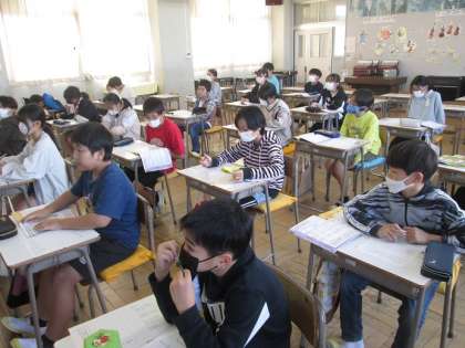 5年1組は国語「どう考える?この投書」の学習です。理由、根拠を入れて、説得力のある文章を書いているところです。