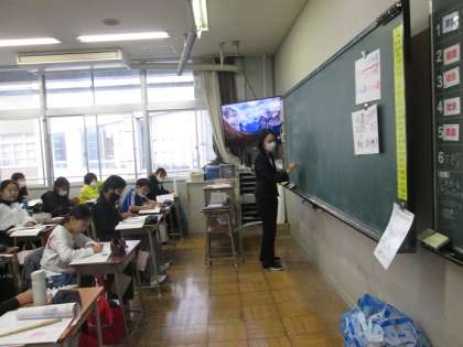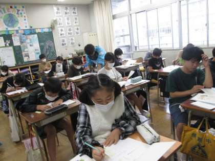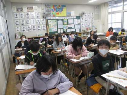 5年3組は算数「割合」の学習です。5回シュートを打ち、5回とも入った時の百分率と歩合を求める考え方の場面でした。