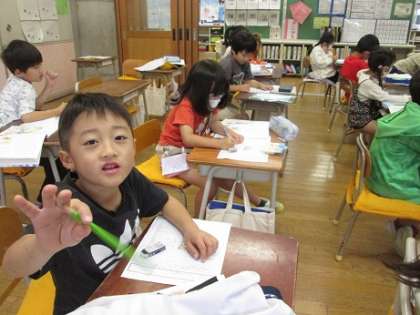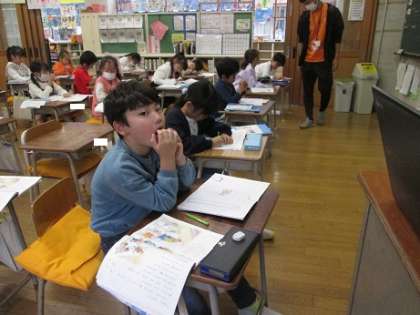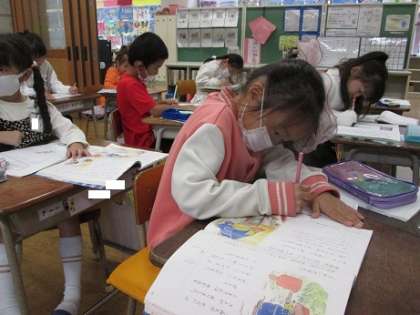 1年生は国語で、「はじめは『や!』」の学習をしました。物語に出てくるくまさんやきつねさんの気持ちを想像しながら読みました。