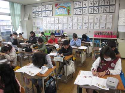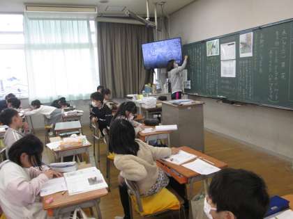3年3組は、「お助け!シュロの糸」というお話です。木、草、花、生き物、身近な自然との関わりについて、経験を踏まえて意見を出し合っていました。