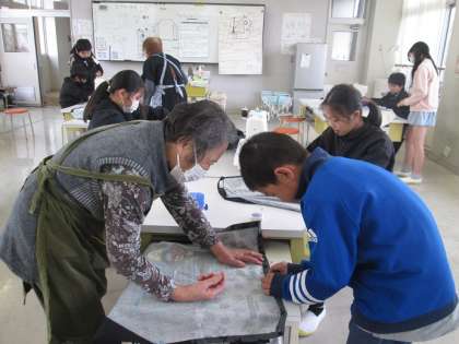 5年1組は家庭科「エプロン作り」の学習です。地域のゲストティーチャーにお越しいただき、ミシンの使い方やアイロンのかけ方も教えていただきました。みんな、安心して作業をしています。地域の方々のご協力、ありがとうございます。