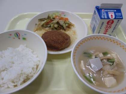 今日の献立は、和風ハンバーグ、大中寺芋の味噌汁、茎わかめと野菜の炒め物、ご飯、牛乳です。