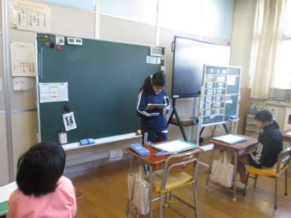 なかよし3組も朝の会です。当番は前に出て司会を行っていました。また、今日の給食の献立の確認もしています。1日が始まります。