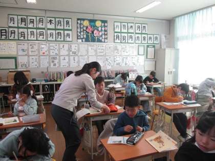 3年3組は、国語「ミニギャラリーの解説委員になろう」の学習です。絵から見えることや想像したことをみんなで考えていました。