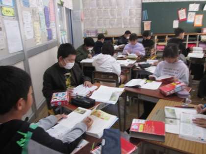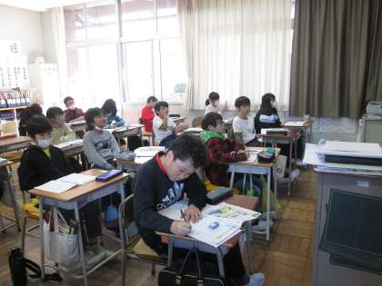 4年2組は、国語「ごんぎつね」の意味調べをしています。「ぬかるみ」「つつみ」「裏手」「びく」などの言葉を辞典を使いながら調べていました。