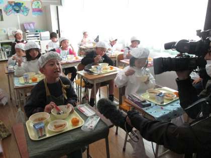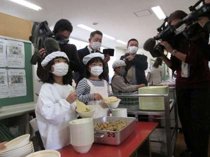 食育授業の後、給食で地産地消のレタスを使った炊き込みレタスチャーハンをいただきました。