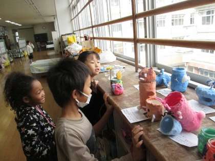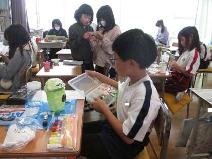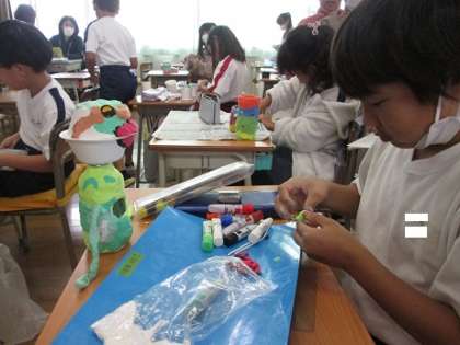 3年生は図工で「空き容器のへんしん」という教材を学習していました。自宅から持ち寄った空き容器に紙粘土をつけていろいろな形を作りました。その後、絵の具で色つけをして完成です。みんな上手に作っていました。