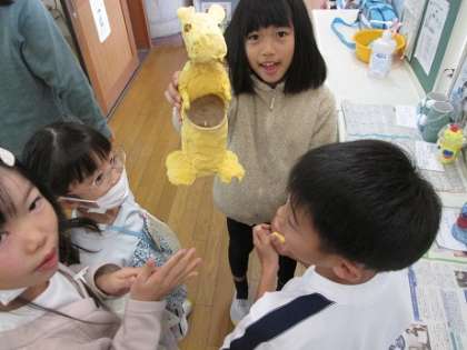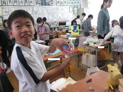 3年生は図工で「空き容器のへんしん」という教材を学習していました。自宅から持ち寄った空き容器に紙粘土をつけていろいろな形を作りました。その後、絵の具で色つけをして完成です。みんな上手に作っていました。
