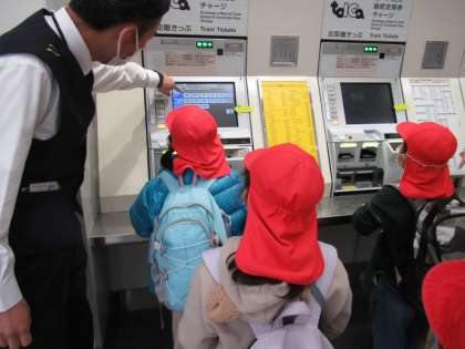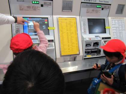 2年生は楽寿園での活動を終え、学校に向け出発しました。13時過ぎの電車に乗るために、まず三島駅で一人一人切符を購入しました。