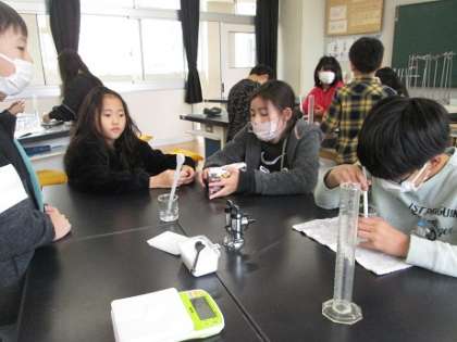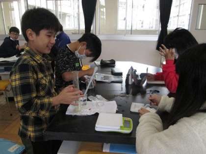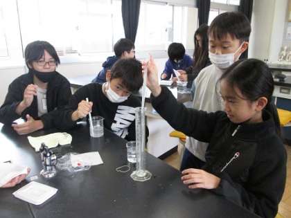 5年生は理科で「水に溶けるものの量」について学習しています。水にミョウバンを溶かすとどうなるか検証実験を行いました。