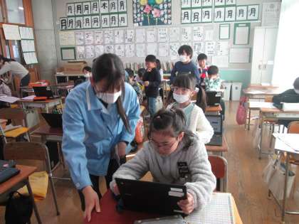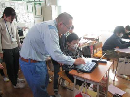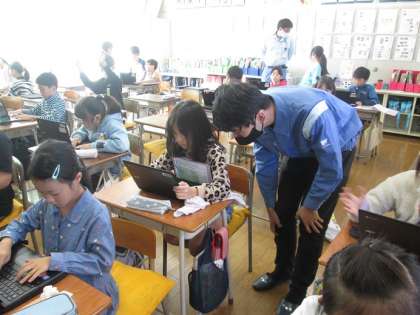 3年3組も総合「金岡の宝」のスライド作りです。こちらにも明電舎さんのゲストティーチャーが来てくださっています。お店見学で行った金岡の宝のお店、お菓子屋さん、お茶屋さん、ラーメン屋さん、自転車屋さんなどについてスライドにまとめています。