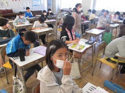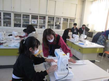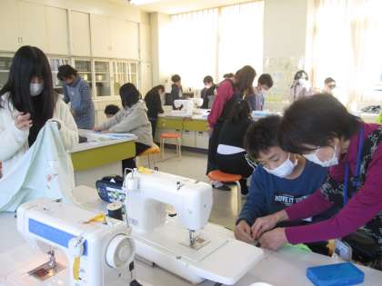 5年3組は家庭科「エプロンを作ろう」の学習です。地域のミシンゲストティーチャーにお越しいただき、アドバイスを受けながらエプロンを製作しています。