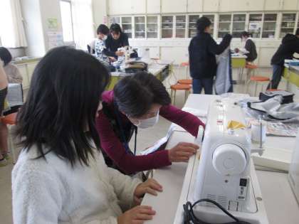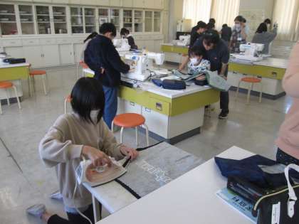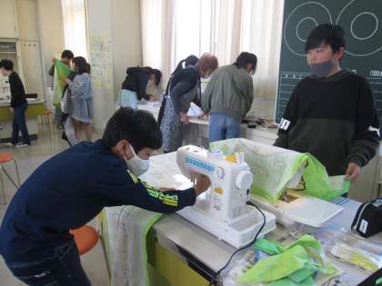 5年4組も家庭科「エプロン作り」の学習です。こちらもゲストティーチャーにミシンやアイロンのかけ方のアドバイスをもらって製作しています。「見て。はにわのデザインなんだよ」と見せてくれる子もいました。だんだん自分の作ったエプロンに愛着が出てきているようです。