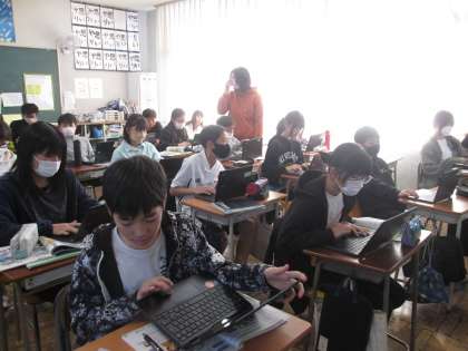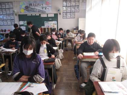 6年3組は算数「1/3の縮図」の学習です。三角形の縮図を工夫して書いています。「思ったより簡単じゃん」というつぶやきも聞かれました。