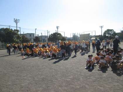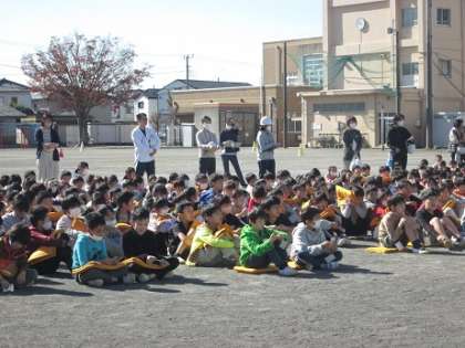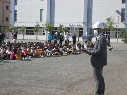 想定の時間内に子どもたちはグラウンドに集合しました。学級、学年で人数確認をし、本部に報告し訓練は終了しました。その後、校長先生が訓練の様子を総括しながら話をしました。