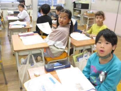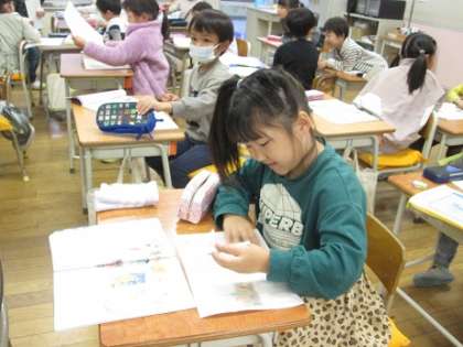 1年生は国語で「はじめは『や!』」の学習を行っています。読みながら、どんな登場人物が出てくるのかを確認しています。積極的に発表しています。
