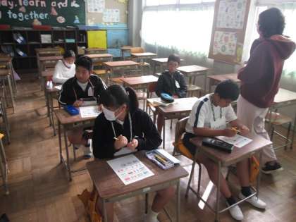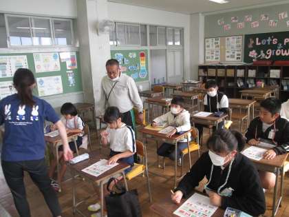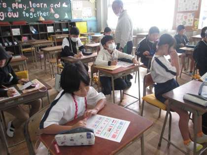 なかよし2,3組は英語の学習です。プリントには国旗と国の名前が英語で書かれています。ALTの先生が国名を英語で話します。みんあは、どこの国かを当てます。クイズのように楽しみながら英語の聞き取りに取り組んでいました。