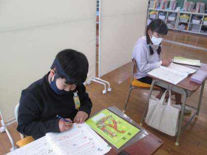 なかよし4組は算数です。低学年は、ひき算をさくらんぼで計算したり、筆算で計算したりしています。また、高学年は小数の学習です。小数点の位置や小数第一位、小数第二位などの言葉も学習しています。