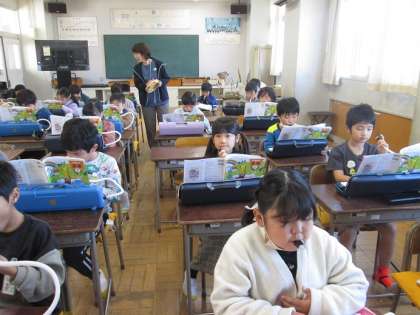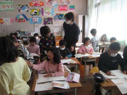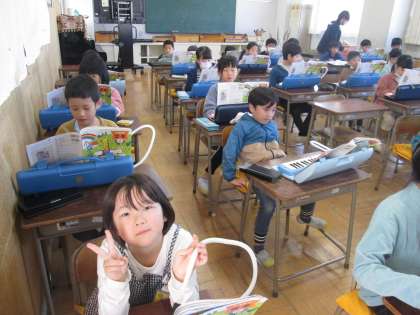 2年3組は音楽で「子ぎつね」を鍵盤ハーモニカで演奏する練習をしていました。ラファドラソ〜♪のところに挑戦です。「(手元を)見なくても弾けるよ」という男の子もいました。練習頑張ってくださいね。