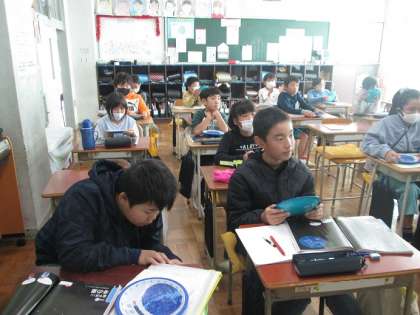4年4組は理科「冬の星座」の学習です。星座早見を使って星座の位置を確認していました。ベテルギウス、シリウス、プロキオンの3つの星をつなぐと「冬の○○○」と呼ばれます。もう覚えたかな?昨日の夜空もとてもきれいな星が見えました。家の人と夜空を見上げて見てはいかがでしょうか。