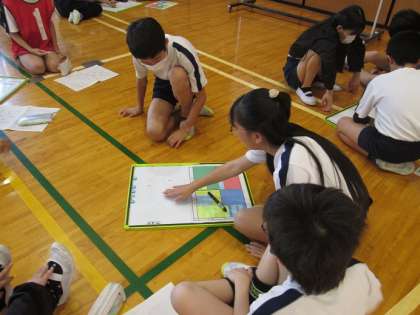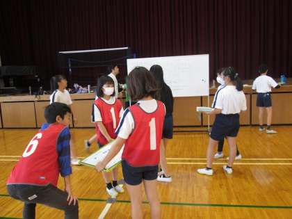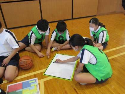 アップの後は、各チームホワイトボードを使って今日の授業のめあてを決めていました。この後は試合形式で練習を行い、ペアチームが気づいたことを付箋に書き込んで伝えます。