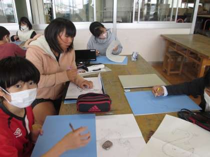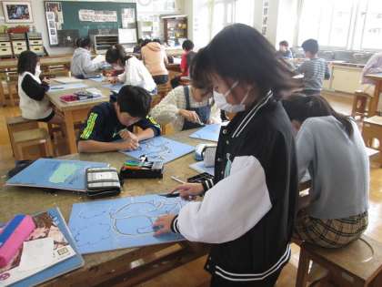 5年4組は、図工「版画」の学習です。みんな、静かに彫り進めています。寒さで手先もかじかみます。けがのないように集中して取り組みましょう。