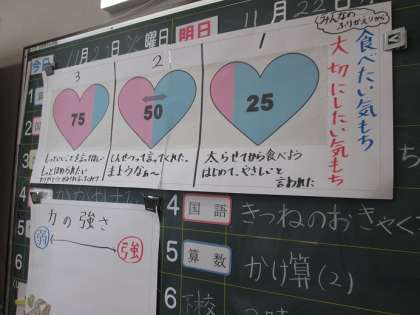 おおかみと戦ったのは、「食べたかったから」「守りたかったから」と二つに分かれました。「教科書○ページ前から○行目にこう書いてあるからです」としっかりと理由を明確にして発表しています。